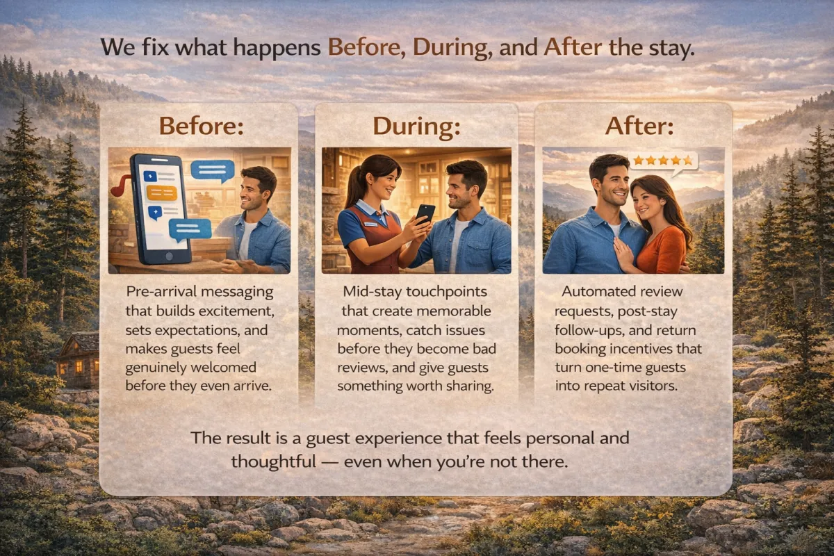 Every touchpoint in the guest journey from the moment they book to after they check out. Pre-arrival information, check-in instructions, mid-stay check-ins, review requests, post-stay follow-ups, and return booking incentives. All of it runs automatically through your existing platforms.